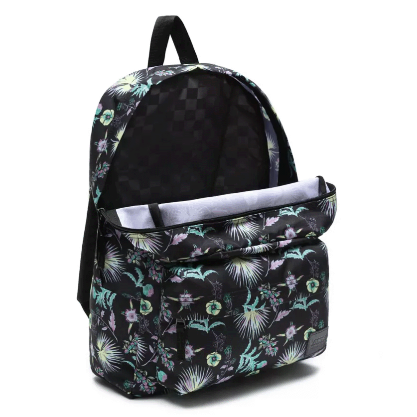 La mochila Floral de P&P tiene un diseño de dos bolsillos con forro repujado en el panel interior trasero. Tiene un compartimento principal con cierre de cremallera, un bolsillo frontal con panel de organización para llevar tus cosas ordenadas y una funda interior para portátil.
