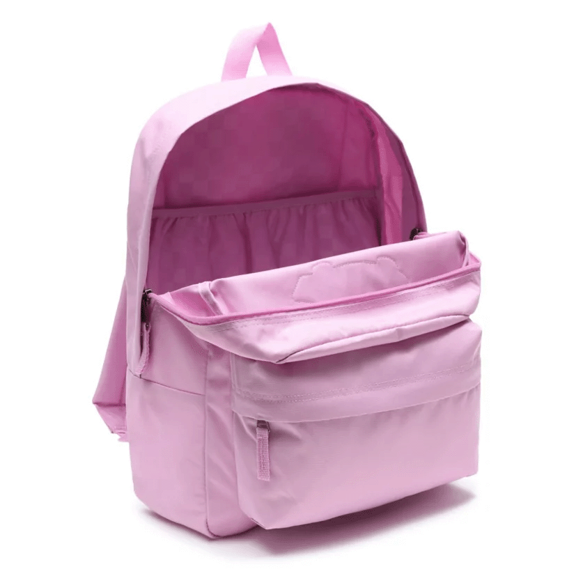 La mochila Rosa de P&P tiene un diseño de dos bolsillos con forro repujado en el panel interior trasero. Tiene un compartimento principal con cierre de cremallera, un bolsillo frontal con panel de organización para llevar tus cosas ordenadas y una funda interior para portátil.