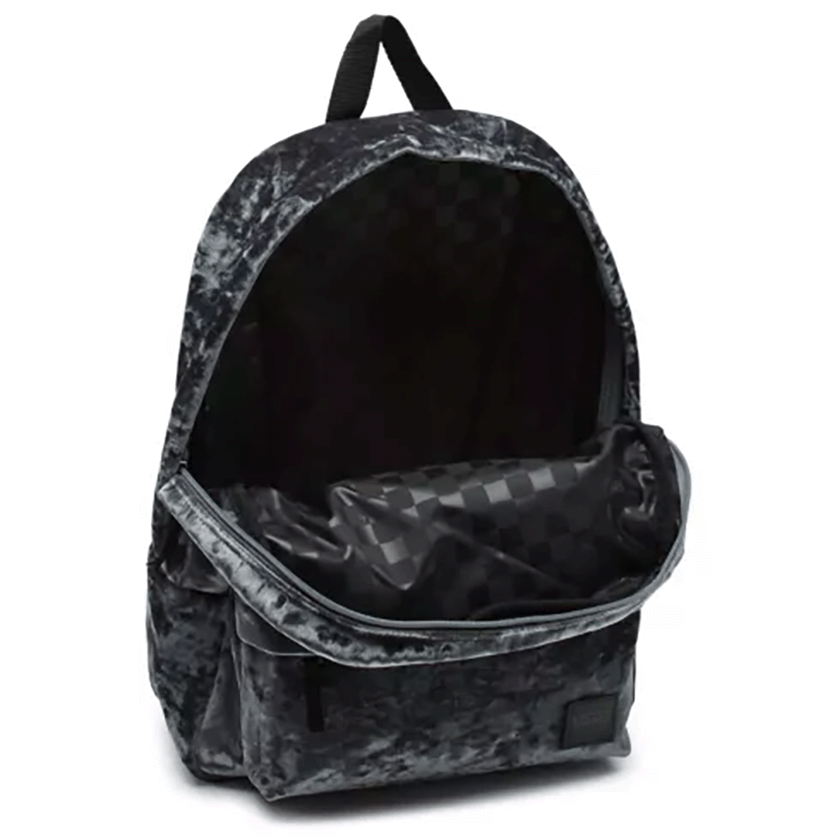 La mochila Terciopelo Negro de P&P tiene un diseño de dos bolsillos con forro repujado en el panel interior trasero. Tiene un compartimento principal con cierre de cremallera, un bolsillo frontal con panel de organización para llevar tus cosas ordenadas y una funda interior para portátil.